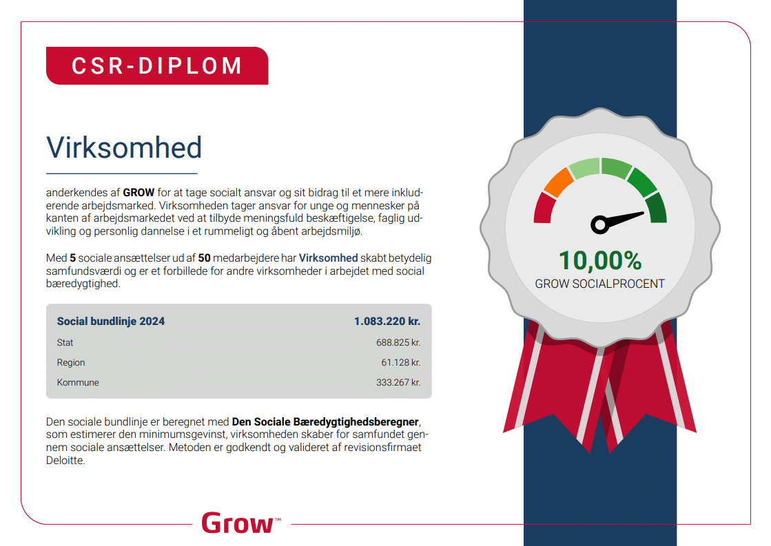 Et CSR-diplom fra GROW er en anerkendelse samt et synligt bevis på virksomhedens sociale ansvar og bidrag til et mere inkluderende arbejdsmarked.