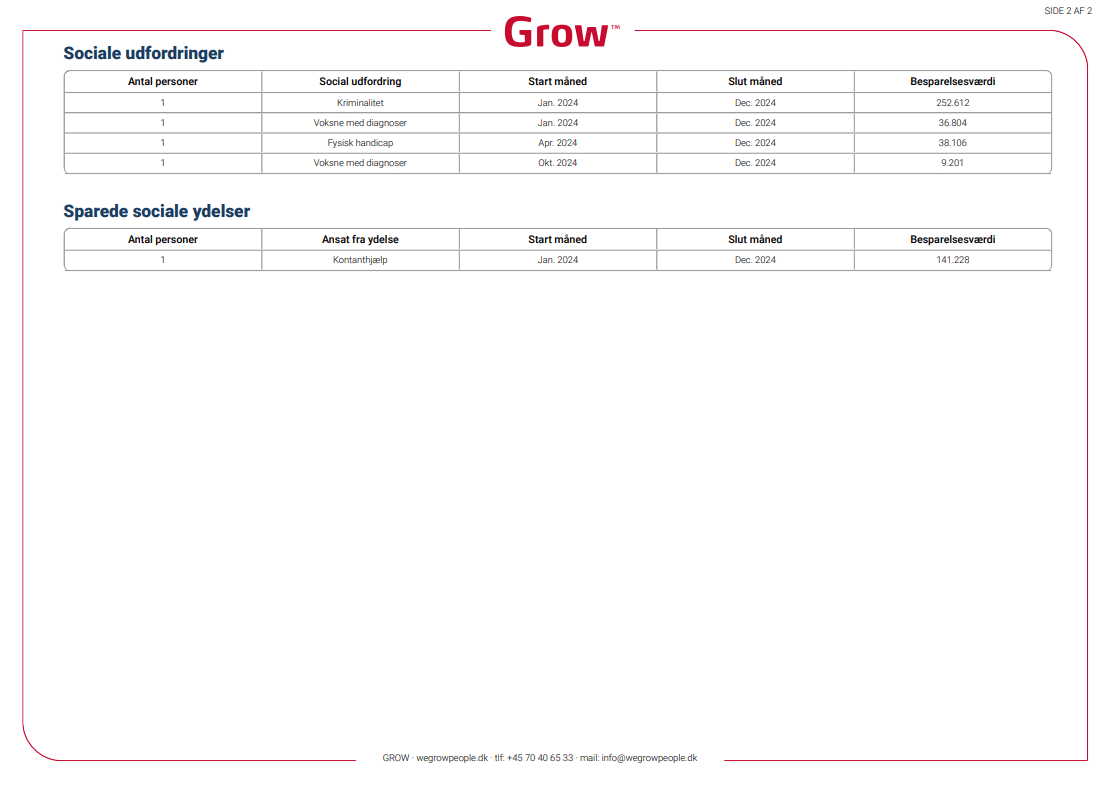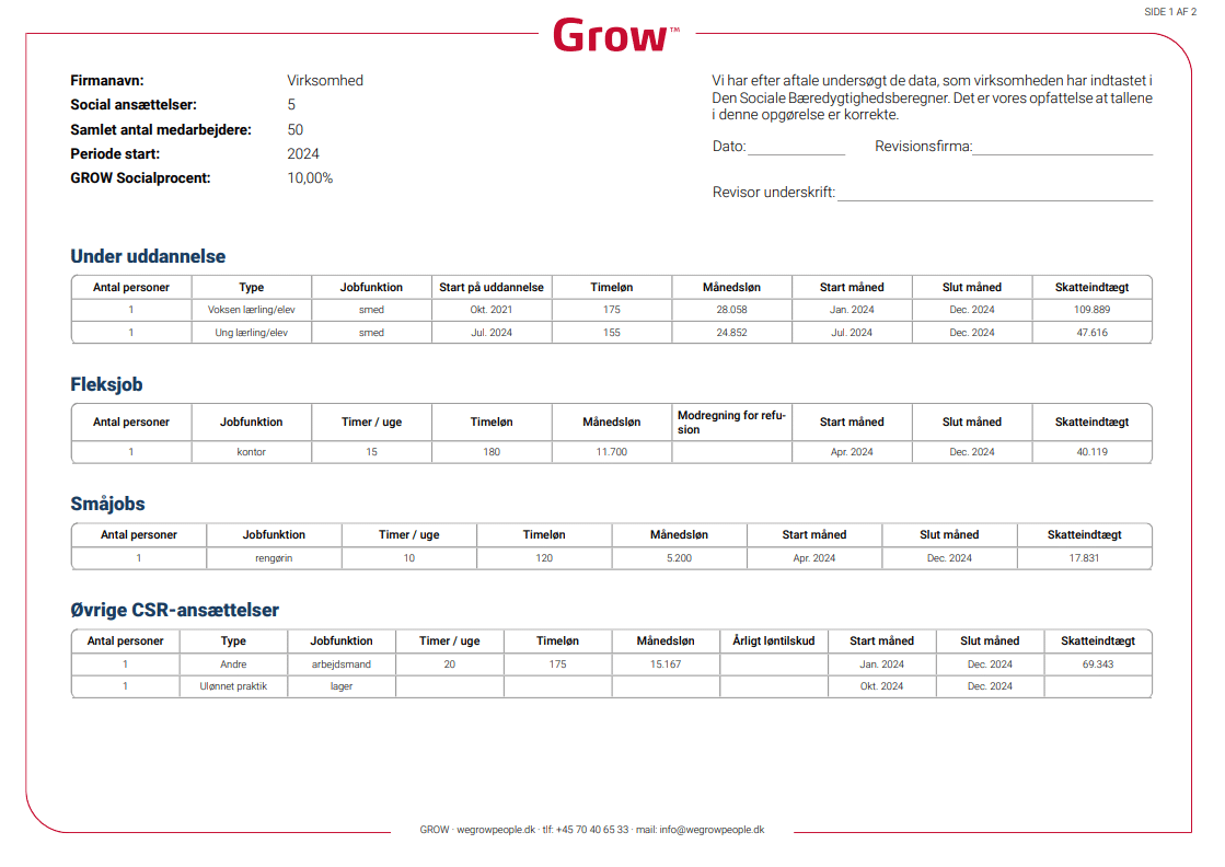 GROWs socialprocent dokumenterer, hvor mange CSR-ansættelser virksomheden har. Det er et bevis på, at virksomheden tager ansvar for unge og mennesker på kanten af arbejdsmarkedet, ved at tilbyde meningsfuld beskæftigelse, faglig udvikling og personlig dannelse i et rummeligt og åbent arbejdsmiljø.